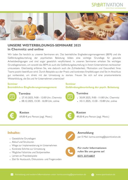Wir laden Sie herzlich zu unseren Seminaren ein. Das betriebliche Eingliederungsmanagement (BEM) bildet eine wichtige Grundlage für gesunde Arbeitsbedingungen und ist sogar gesetzlich verpflichtend. In unseren Seminaren erhalten Sie wichtiges Grundlagenwissen, um das BEM in Ihrem Unternehmen rechtssicher umzusetzen. Gleichzeitig erfahren Sie, wie dadurch auch die Zufriedenheit, Motivation und Gesundheit Ihres Teams positiv beeinflusst wird. Durch Beispiele aus der Praxis und konkreten Empfehlungen sind Sie im Anschluss gut vorbereitet, um direkt mit der Umsetzung zu starten. Freuen Sie sich auf eine praxisorientierte Weiterbildung, die Sie und Ihr Unternehmen unterstützt!